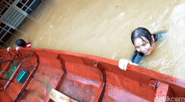 Gambar yang diterima detikcom, terlihat seorang perempuan tampak berenang mencapai perahu di tengah genangan banjir karena ketinggian air sempat mencapai ketinggian 4 meter. "Air sempat meninggi, namun saat ini perlahan mulai surut hingga sekitar 20 sentimeter," imbuhnya.