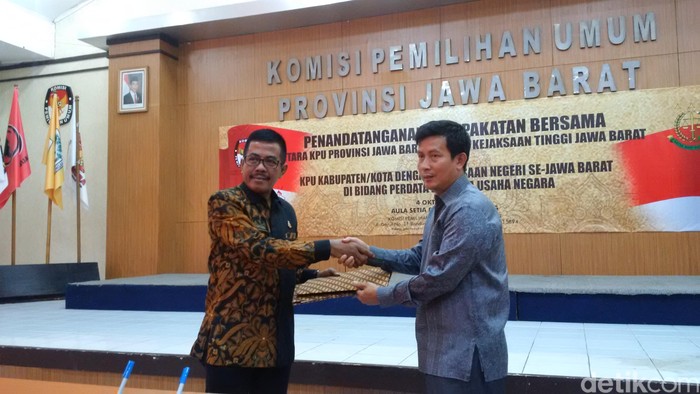 Penandatanganan kerja sama ini berlangsung di aula KPU Jabar, Jalan Garut, Kota Bandung, Rabu (4/10/2017). Hadir dalam acara tersebut Kepala Kejati Jabar Setia Untung Arimuladi, Ketua KPU Jabar Yayat Hidayat, Ketua Bawaslu Jabar Harminus Koto, dan perwakilan KPU di 16 kabupate/kota dan juga Kejaksaan Negeri.