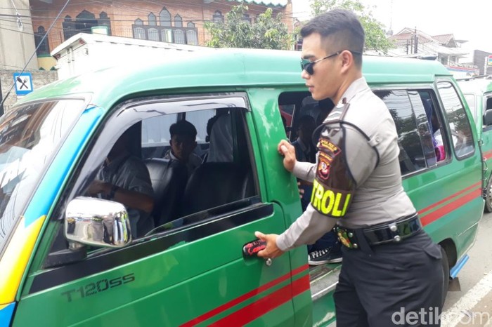 Polisi duduk di depan untuk mengawal angkot di Kopo, Kabupaten Bandung. (Foto: Wisma Putra/detikcom)