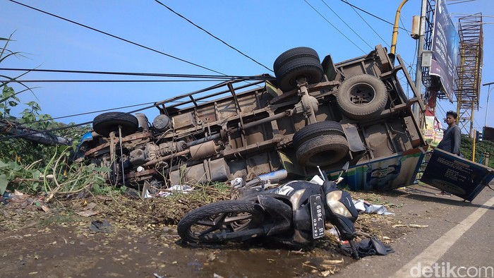 Pengendara motor bernama Agus Rafiqusubhan (39), warga Kelurahan Kalijaga, Kecamatan Harjamukti, Kota Cirebon, tergencet badan truk yang terguling ke parit dan menghantam tiang lampu.