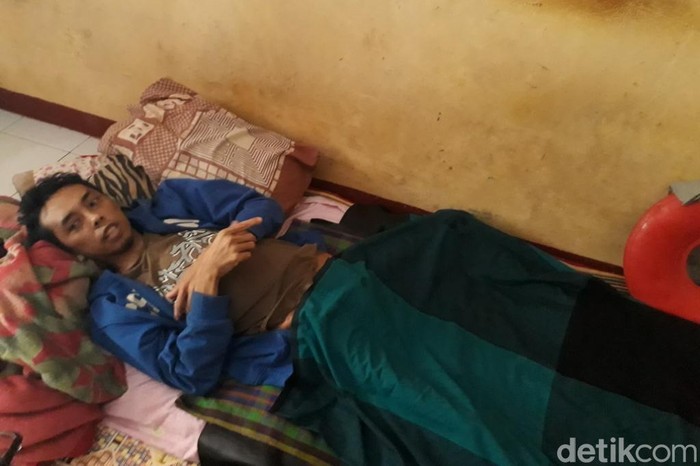 Karena sudah tidak dapat beraktivitas lagi, Roni hanya bisa terbaring lemah di sebuah kasur bisa yang digelar di ruangan tengah rumahnya, sedangkan bagian tubuh yang infeksi ditutup menggunakan selimut.