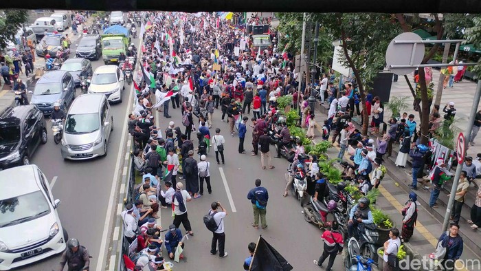 Telihat pula sejumlah massa membawa bendera Palestina dan bendera organisasi masing-masing. Nampak pula bendera Indonesia berkibar di tengah-tengah massa. Beberapa massa juga nampak membawa sejumlah spanduk yang mengecam pernyataan Donald Trump terkait Yerusalem sebagai ibu kota Palestina seperti 'Bebaskan Kiblat Pertama yang Terpenjara Kezaliman' dan 'No US Embassy'.