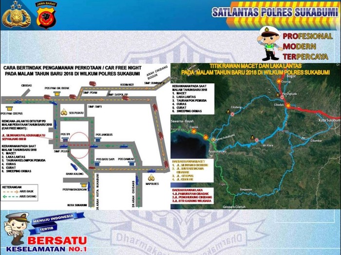 "Pas malam tahun baru nanti akan ada Car Free Night di sepanjang jalan Siliwangi, Palabuhanratu kita akan menutup arus dan mengalihkannya melalui jalan alternatif dari arah Kota Sukabumi dan sekitarnya dialihkan menuju Jalan Jayanti - Rawa Kalong. Arus dari Arah Jalan Cangehgar dan Jalan Bhayangkara dialihkan menuju Jalan Empang Raya," kata Galih, melalui sambungan telepon dengan detikcom, Jumat (29/12/2017).