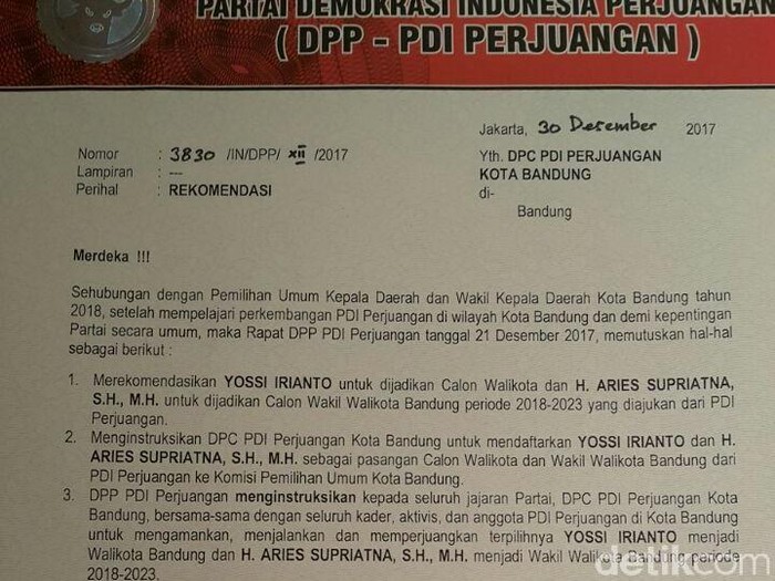 Hal itu dipastikan setelah beredarnya surat rekomendasi No 3830 pertanggal 30 Desember 2017 yang disahkan oleh Ketua DPD PDIP Bambang DH dan Sekjen DPD PDIP Hasto Kristiyanto.