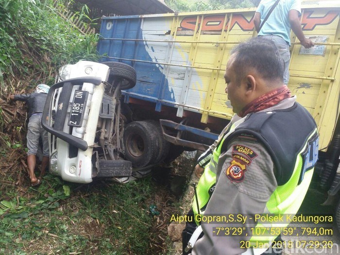 Peristiwa tersebut terjadi Sabtu (20/1/18) di Jalan Raya Kadungora-Nagreg, Desa Gandamekar, Kadungora. Truk bernopol D 8591 VT yang dikemudikan Udin (53) tersebut melaju dari arah Kadungora menuju Bandung.