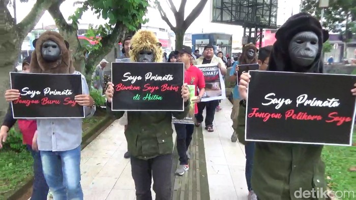 Guna membetot perhatian warga, sejumlah aktivis sengaja memasang topeng primata. Mereka tak henti berorasi agar warga tidak memperjualbelikan primata.