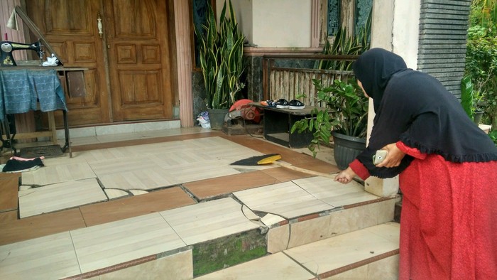 "Kondisi rumah sudah miring dan banyak retakan di dinding dan lantai. Khawatir roboh jadi kami sekeluarga mengungsi ke rumah orang tua," ungkapnya saat ditemui di rumahnya yang retak-retak.