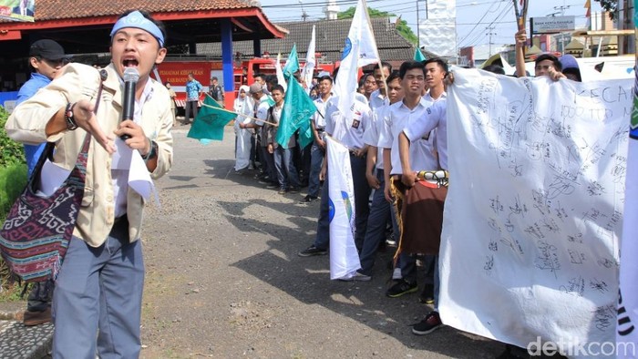 Pantauan detikcom, Selasa (17/4/2018) aksi ratusan pelajar itu digelar di halaman Kantor Kecamatan Cicalengka. Sebelumnya, ratusan orang itu melakukan longmarch dari sekolahnya masing-masing menuju Kantor Kecamatan Cicalengka.