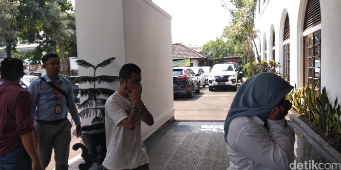 Para tersangka datang menggunakan mobil Ditreskrimum Polda Jabar. Faisal mengenakan kaos putih sementara tersangka perempuan kompak mengenakan kemeja putih.