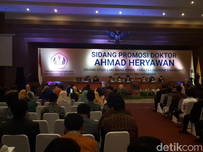 Sidang promosi doktor untuk Ahmad Heryawan (Aher) ini berlangsung di Graha Sanusi Unpad di Jalan Dipatiukur, Kota Bandung, Rabu (9/5/2018). Sidang terbuka ini dipimpin langsung oleh Rektor Unpad Tri Hanggono dan penguji lainnya.
