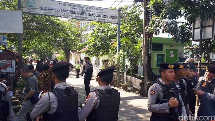 Berdasarkan pantauan detikcom pada Minggu (8/7/2018), pengamanan polisi bersama TNI dilakukan sejak pintu awal menuju kantor KPU Jabar, Jalan Garut, Kota Bandung. Polisi bersenjata lengkap terlihat berjaga.