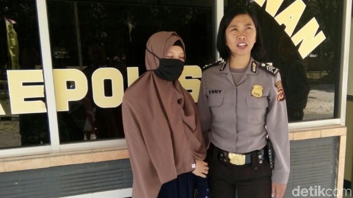 Diapit polwan, RP menggunakan kerudung coklat dengan wajahnya tertutup masker kain hitam. RP menjalani pemeriksaan di Mapolsek Cikembar.