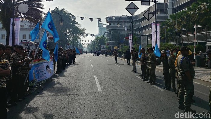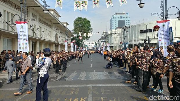 Pantauan detikcom Jalan Asia Afrika mulai ditutup pukul 8.30 WIB. Terlihat sejumlah elemen masyarakat sudah mulai berjajar untuk menyambut enam kepala daerah yang akan melakukan historical walk menuju Gedung Merdeka.