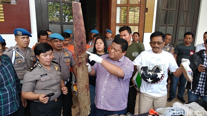 Dalam rilis yang digelar di Mapolrestabes Bandung, Jalan Jawa, Kota Bandung, Senin (24/9/2018), polisi menampilkan pelaku dan sejumlah barang bukti yang digunakan untuk menganiaya korban. Barang bukti dari mulai pakaian, sepatu, kayu berukuran besar, helm, pecahan piring dan botol serta barang lainnya.