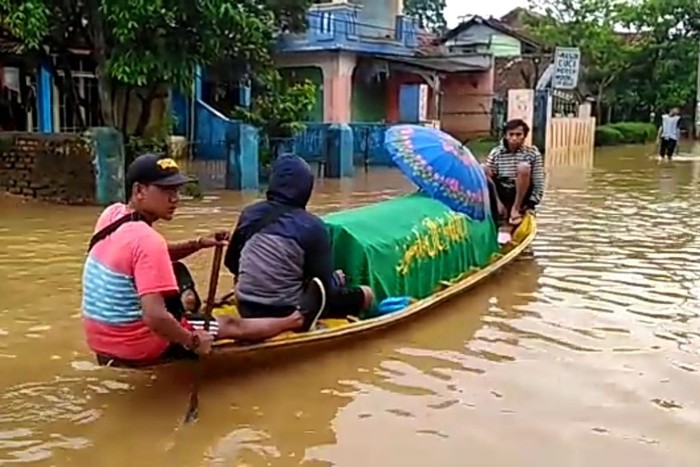 Warga membawa keranda pakai perahu kemudian melewati genangan banjir yang melanda Jalan Raya Andir-Katapang hingga ke wilayah yang tidak tergenang banjir. "Kedalaman banjirnya sekitar 50-120 sentimeter," ucap Dedi.