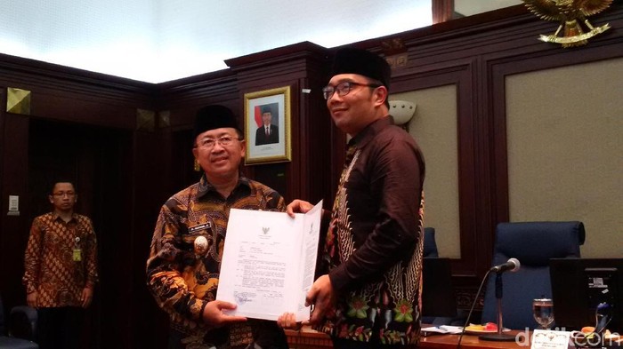 Gubernur Jawa Barat Ridwan Kamil menyerahkan secara langsung surat tugas dari Kementerian Dalam Negeri sebagai Plt Bupati Cianjur kepada Herman Suherman, di Gedung Sate, Kota Bandung, Jumat (14/12/2018).