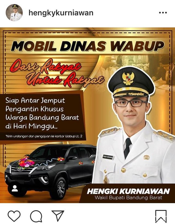Melalui postingan di akun Instagramnya kemarin, Hengky menyewakan mobil dinasnya secara gratis bagi warga KBB yang hendak melangsungkan pernikahan pada hari Minggu. Hingga kini, postingan tersebut telah ditanggapi oleh lebih dari 700 pengguna media sosial atau akrab disapa netizen. Untuk diketahui mobil dinasnya adalah Toyota Fortuner.