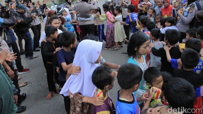 Anak-anak yang berusia 4-10 tahun itu, semakin semangat setelah diberikan hadiah makanan ringan dan cokelat karena bisa bernyanyi dan menari.