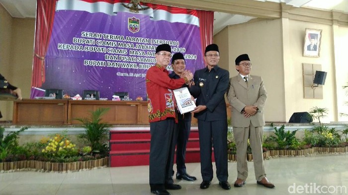 Pemkab Ciamis menyelenggarakan serah terima jabatan (Sertijab) dari Bupati Iing Syam Arfin kepada Bupati Ciamis Herdiat Sunarya di Gedung Islamic Center, Selasa (23/4/2019).
