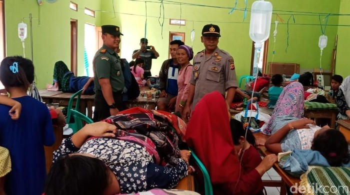 Meja-meja di ruang belajar dijadikan tempat warga berobat, pemasangan infus menggunakan tali yang diikatkan pada dinding, mirip jemuran. Meski terbatas, Aguk memastikan kondisi warga berangsur membaik. Sejumlah warga lainnya mendapat rujukan ke rumah sakit.