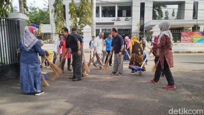 Sejumlah PNS di Ciamis tengah bebersih di kompleks perkantoran. (Foto: Dadang Hermansyah/detikcom) |
