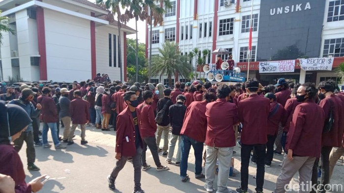 Ratusan mahasiswa Universitas Singaperbangsa Karawang (Unsika) berunjuk rasa menuntut kebijakan kampus soal Uang Kuliah Tunggal (UKT). Berdemo di depan kampus, mahasiswa aktif ini meminta relaksasi di tengah pandemi.