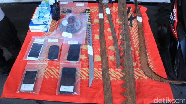 Senjata tajam itu didapat polisi dari para pelaku yang terlibat penganiayaan warga, inisial G, beberapa waktu lalu. Para tersangka yang ditangkap polisi yaitu SIP (16), MA 21, SR alias R (19) dan DR alias A (24). Polisi menembak dua tersangka lantaran berusaha melawan dan melarikan diri ketika akan ditangkap.