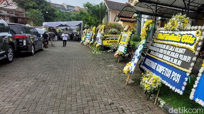 Pantauan detikcom, Selasa (1/6/2021), terlihat sejumlah karangan bunga ucapa duka cita meulai memenuhi pelataran rumah duka di Komplek Alamanda Dago Permai, Kota Bandung. Tampak karangan bunga dari sejumlah piak seperti Ketua MPR Bambang Susatyo, Wali Kota Bandung Oded M Danial dan pihak lainnya.
