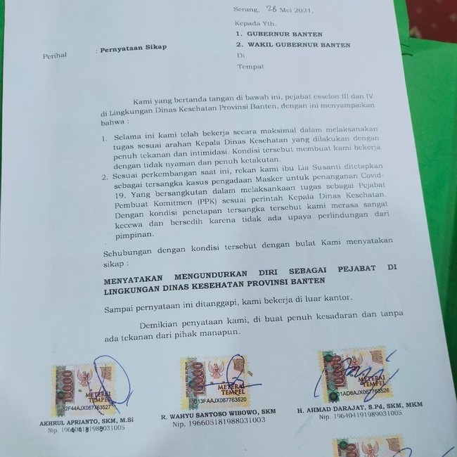 "Menyatakan mengundurkan diri sebagai pejabat di lingkungan Dinas Kesehatan Provinsi Banten," ujarnya.