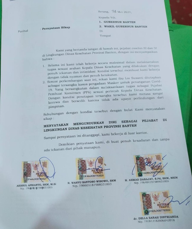 Pernyataan pengunduran diri itu tertera tanda tangan basah dan bermaterai dan ditandatangani pada 28 Mei. Surat dikirim ke gubernur dan wakil dengan tembusan mulai dari Ketua DPRD hingga Kepala Badan Kepegawaian Daerah atau BKD.