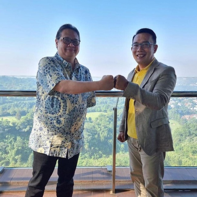 Gubernur Jabar Ridwan Kamil menemui Ketua Umum Partai Golkar Airlangga Hartarto di Hotel Intercontinental, Kota Bandung, Sabtu (5/6/2021) pagi. Dari foto yang beredar, keduanya berfoto bersama di atas balkon. Ada momen saat mereka berpose 'adu kepal'. Kode siap-siap duet Pilpres 2024?