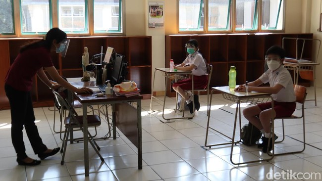 Tak hanya di luar ruangan, di dalam ruangan pun para siswa harus tetap menjaga jarak. Meja dan kursi pun ditata kembali agar memiliki jarak antara meja satu dan meja lainnya.