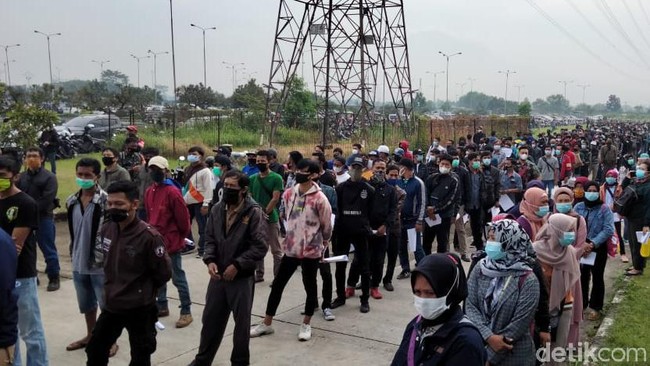 Antrean warga mengular di lokasi. Antrean dibagi menjadi lima antrean. Mereka mengantre sambil membawa formulir.