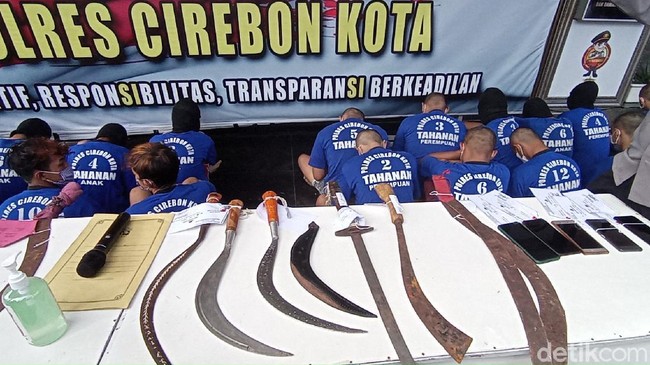 Sat Reskrim Polres Cirebon Kota, Jawa Barat, meringkus 20 anggota geng bersenjata tajam (sajam) yang terlibat tawuran. 20 tersangka itu merupakan anggota dari empat geng yang terlibat tawuran.