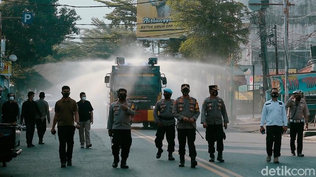 Mobil Armored Water Cannon dikerahkan menyemprotkan 6.000 liter cairan disinfektan di sejumlah jalan protokol di Kabupaten Sukabumi. Kendaraan dilengkapi pengeras suara hingga kendaraan UTV Black Marlin menjelajah pusat kota Palabuhanratu sejak pagi hingga siang ini berkaitan pelaksanaan PPKM Darurat.