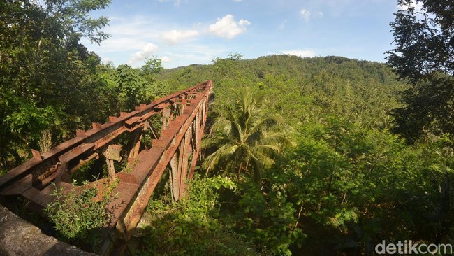 Fondasi beton jembatan masih terlihat kokoh di dasar lembah, menjulang tinggi. Sementara bagian rangka rel sudah mulai digerogoti karat. Bentangan rel semuanya raib.