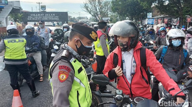 Petugas melakukan penjagaan sekaligus mengecek dokumen persyaratan masuk ke Bandung. Kendaraan roda dua dan empat diberhentikan petugas. Bagi kendaraan yang membawa persyaratan dipersilakan melanjutkan perjalanan. Namun sebaliknya, bagi yang tidak lengkap diputarbalik.