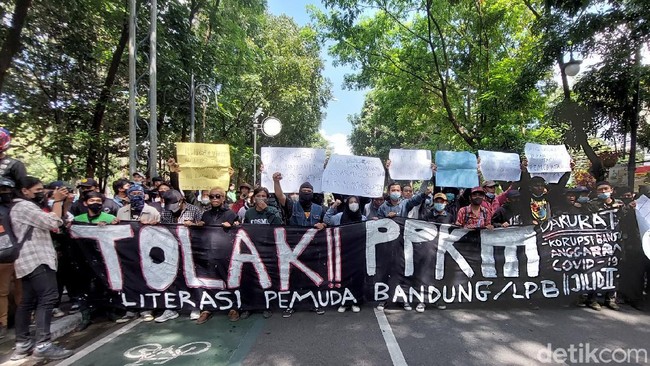 Massa menggelar aksi menolak perpanjangan Pemberlakuan Pembatasan Kegiatan Masyarakat (PPKM) di Kota Bandung. Mereka berunjuk rasa di depan Balai Kota (Balkot) Bandung atau kantor wali kota, Jalan Wastukencana.