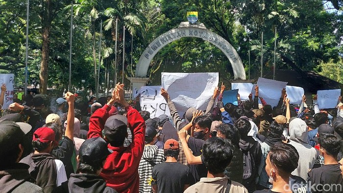Massa dari kalangan driver ojek online (ojol), pedagang dan mahasiswa berunjuk rasa di depan Balai Kota (Balkot) Bandung, Rabu (21/7/2021). Mereka menolak perpanjangan PPKM di Kota Bandung.
