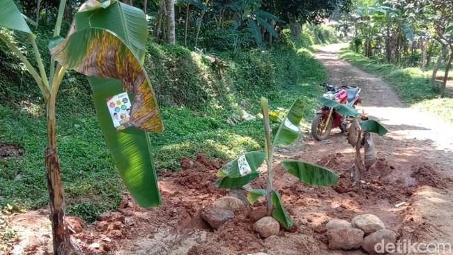Warga Desa Gelaranyar, Kabupaten Cianjur, menanam pohon pisang di area jalan yang rusak. Aksi protes itu dilakukan lantaran warga kesal jalan tak kunjung diperbaiki. Sudah tiga bupati menjanjikan perbaikan jalan tersebut. Namun realisasinya nihil.