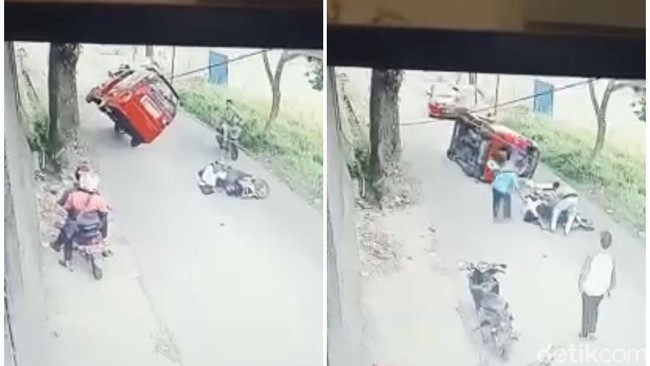 Sebuah angkutan kota (angkot) terguling usai membanting setir saat menghindari pemotor yang tiba-tiba terjatuh. Detik-detik kejadian tersebut terekam dalam CCTV yang kemudian viral di media sosial dan aplikasi perpesanan.