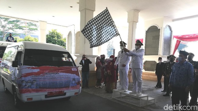 Penyaluran paket sembako tersebut, secara simbolis dilepas langsung oleh Bupati Sumedang Dony Ahmad Munir bersama wakilnya Erwan Setiawan dan disaksikan oleh jajaran Forkopimda Sumedang seusai pelaksanaan Upacara Bendera Peringatan HUT RI ke-76 di Area Gedung Induk Pusat Pemkab Sumedang, Selasa (17/8/2021).
