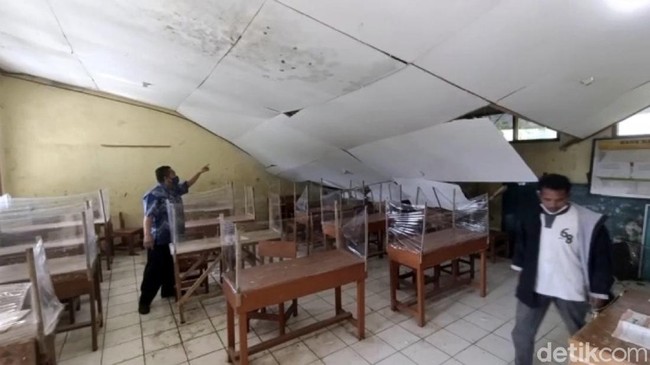 Pantauan detikcom, sejumlah atap yang terbuat dari baja ringan ambruk ke lantai. Genting juga berceceran di atas meja dan kursi pelajar. Tidak ada korban jiwa akibat kejadian tersebut.