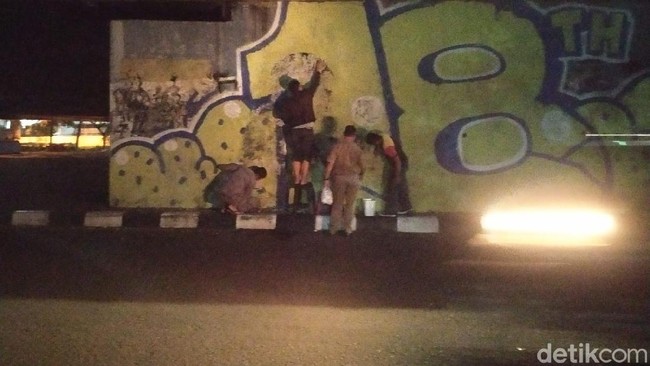 Terlihat empat orang pria tengah membersihkan mural tersebut, mereka mengerik kertas dari dinding dengan menggunakan pisau. "Bahannya kertas ditempel pakai lem," ujar pria yang tengah membersihkan mural tersebut.