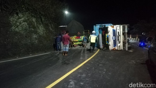 Tidak ada korban jiwa akibat kecelakaan ini. Truk yang terguling bersama muatannya itu menutupi seluruh badan jalan.