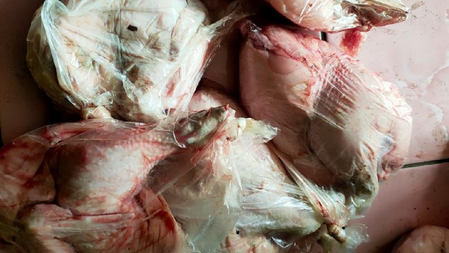 "Ada beberapa yang tidak layak konsumsi. Ayam potong yang diterima sudah bau. Warnanya juga sudah membiru, jadi saya tidak berani konsumsi sembakonya," ujar Tarti (42), warga setempat.
