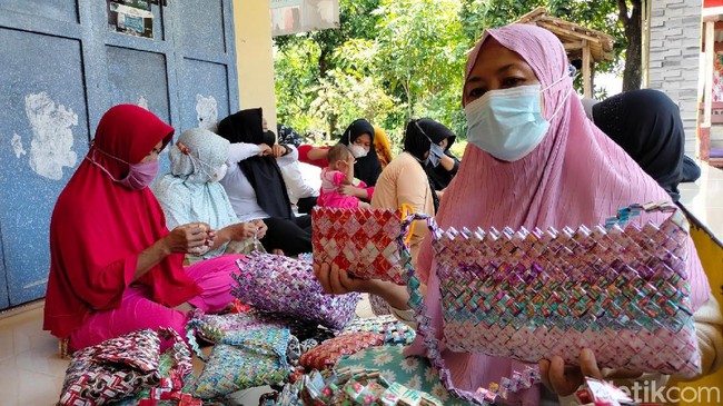 "Bikin kerajinan dari sampah plastik dibikin tas kecil, dompet, tikar ada yang dari bekas kemasan kopi, bungkus sabun cair itu yang kami lakukan di sini," ucap Yanti (48) salah satu ibu-ibu yang ikut membuat kerajinan saat ditemui detikcom, Rabu (22/9/2021).