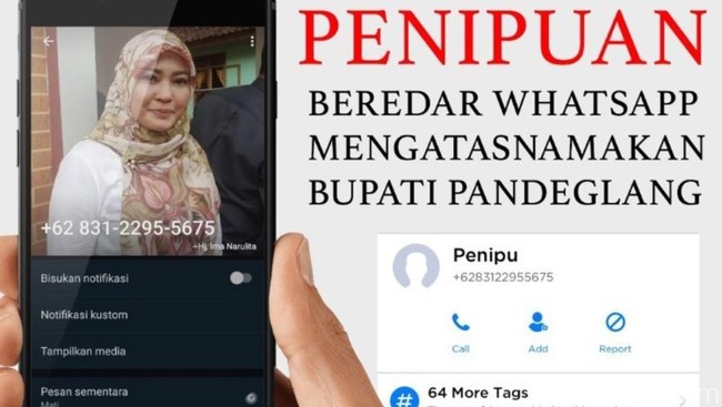 Nama Bupati Pandeglang Irna Narulita dicatut dan digunakan untuk melakukan penipuan. Si penipu menggunakan nomor WhatsApp 083122955675 untuk mengincar korbannya.