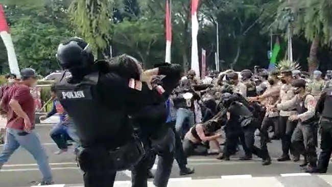 Di video itu terjadi kericuhan saat demo. Sejumlah polisi dan mahasiswa terlibat aksi dorong-dorongan.