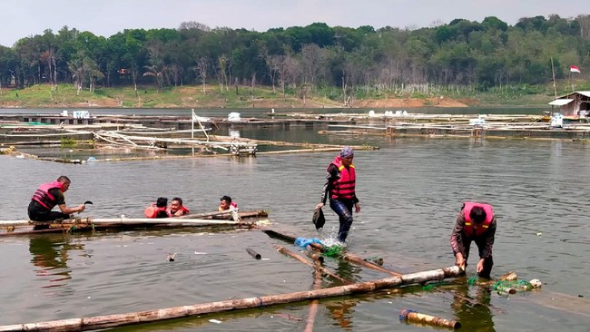 Aparat yang berangkat menggunakan dua perahu. Petugas memakai pelampung dan berenang saat membongkar KJA yang rangkanya terbuat dari bambu.